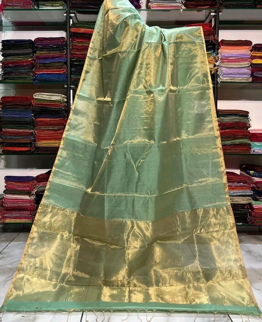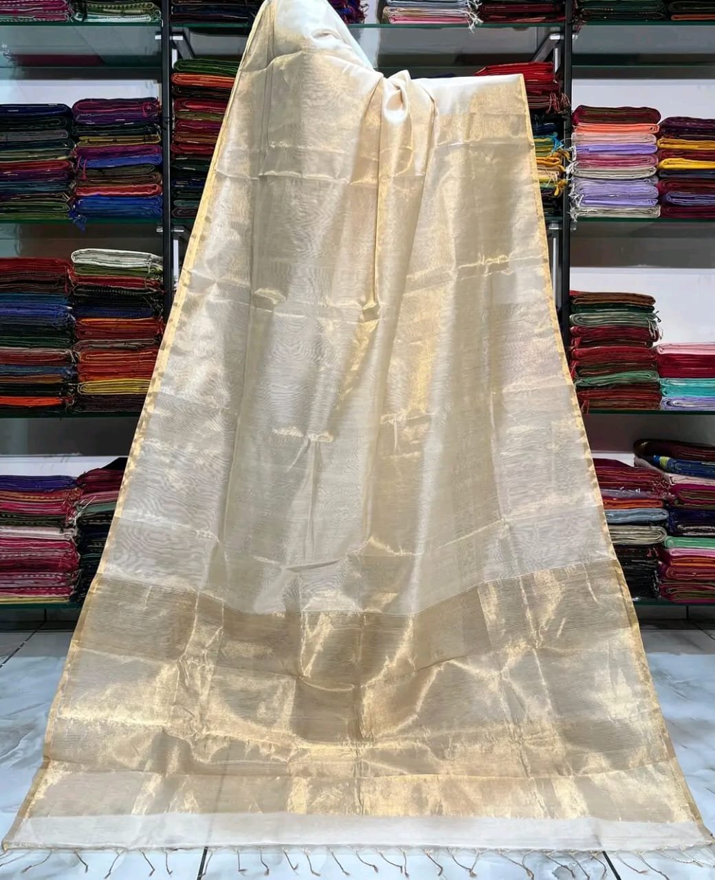 Maheshwari handloom full tissue saree featuring an elegant zari piping border, handcrafted with fine detailing.